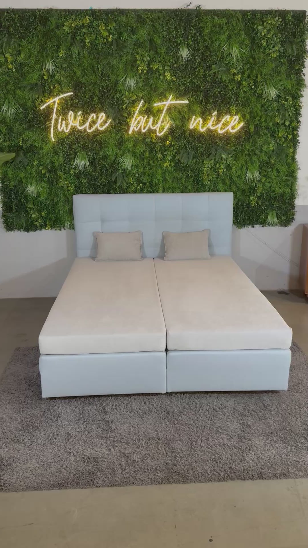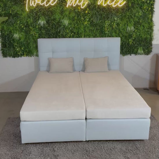 Zum Verkauf steht ein komfortables Boxspringbett bestehend aus zwei Boxen, auf die jeweils Matratzen gelegt werden. Der Bezug der aufliegenden Matratzen ist abnehmbar und waschbar, was die Pflege besonders einfach macht.