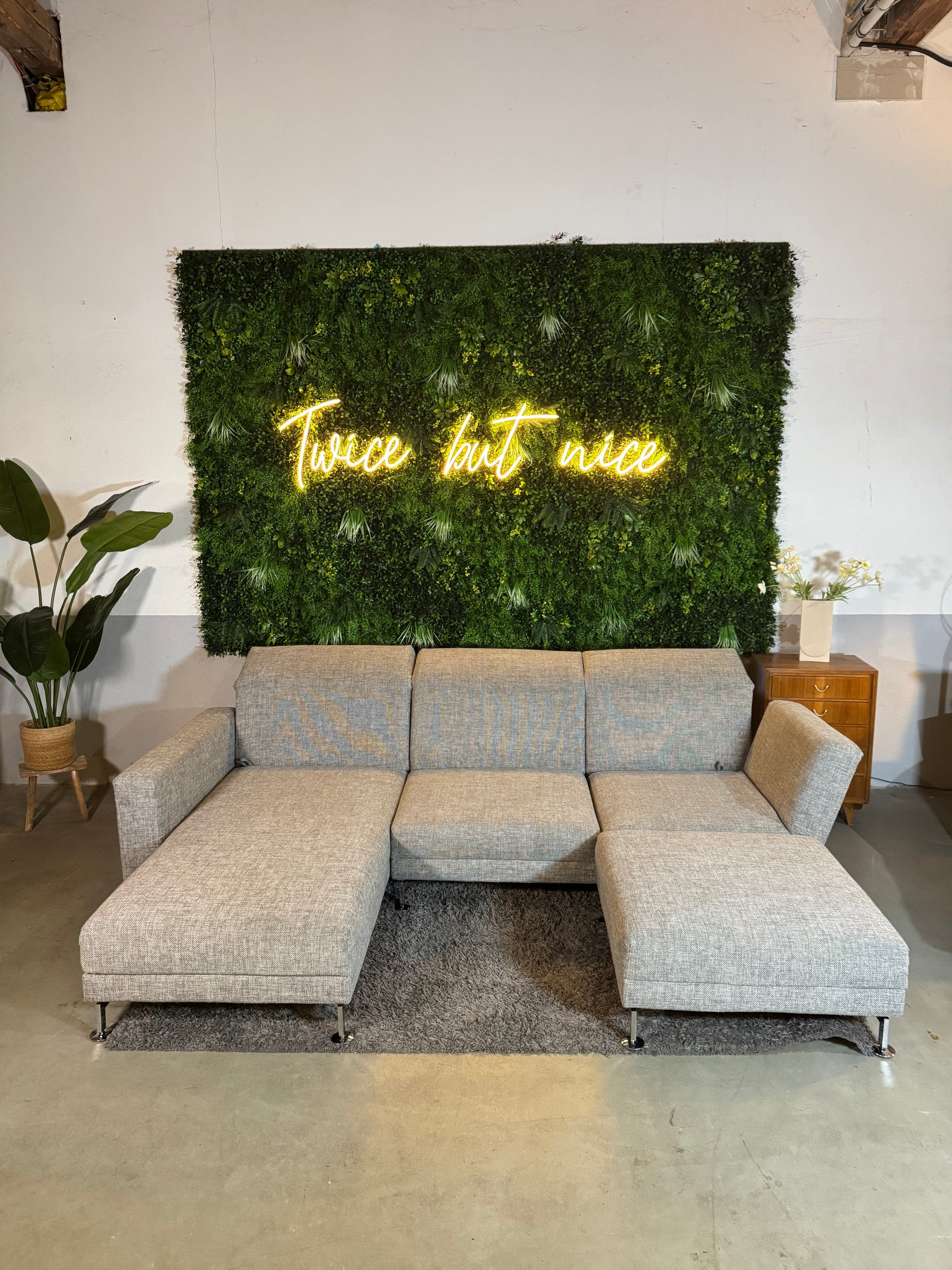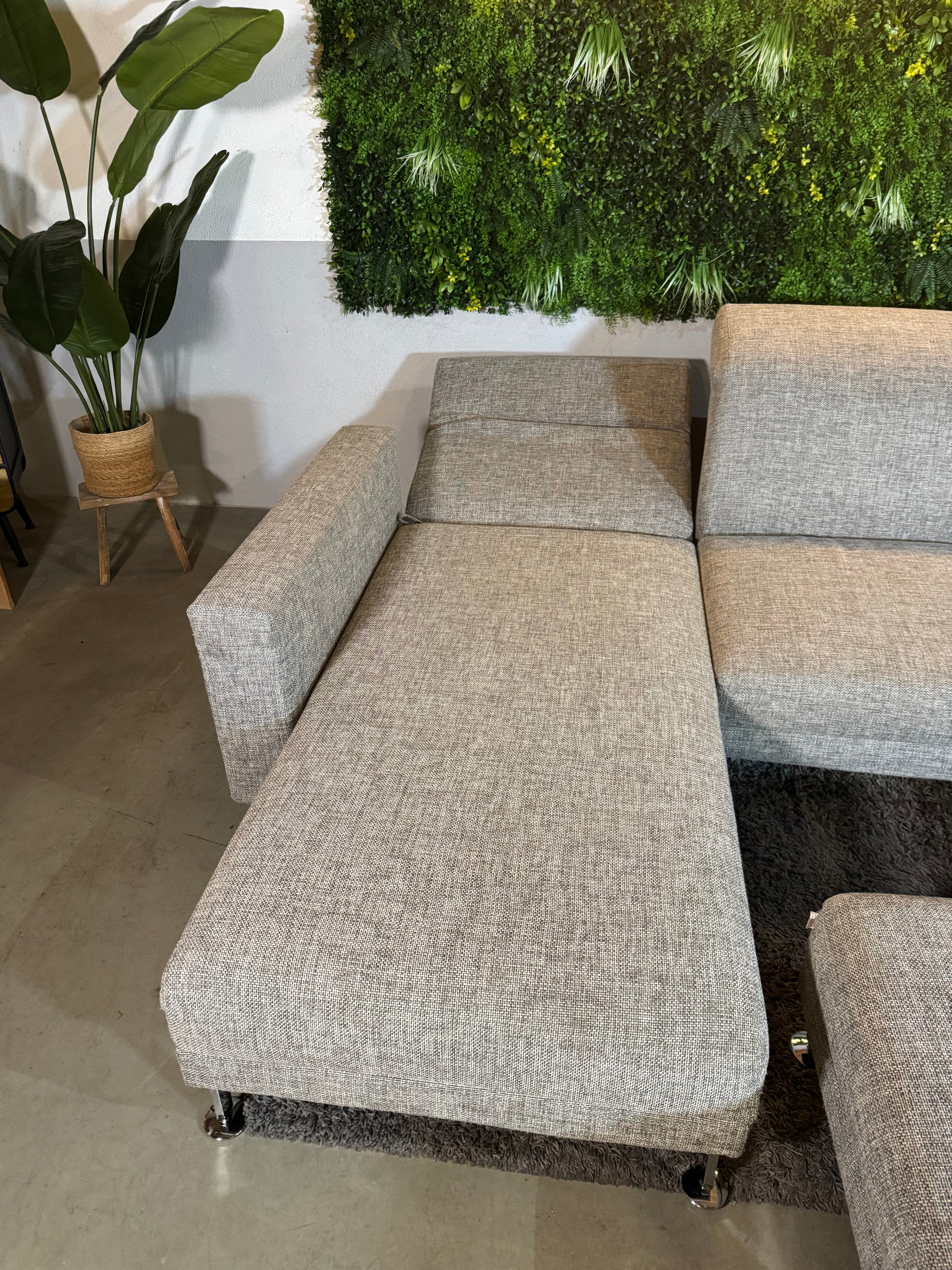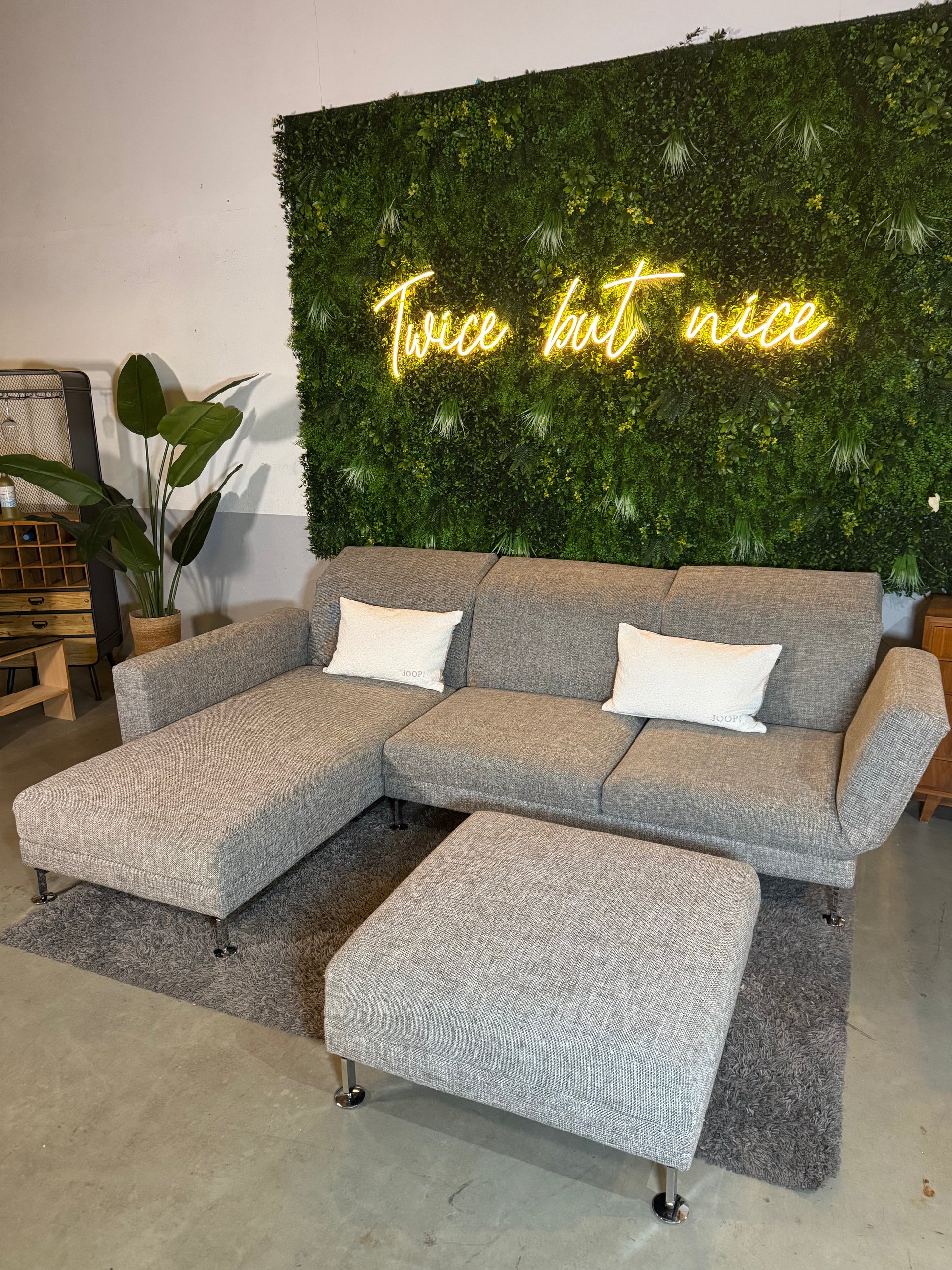 Angeboten wird ein wunderschönes Designer Ecksofa der Marke „Brühl“ in grau mit silbernen Füßen und Beistellhocker.